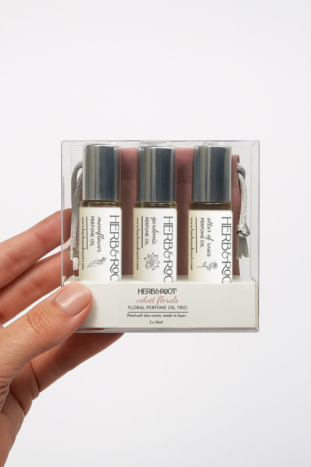 Romantic and timeless, Velvet Florals captures the beauty of fresh blossoms and moonlit gardens. This trio is soft, feminine, and perfect for those who love floral notes that feel sophisticated, not powdery.