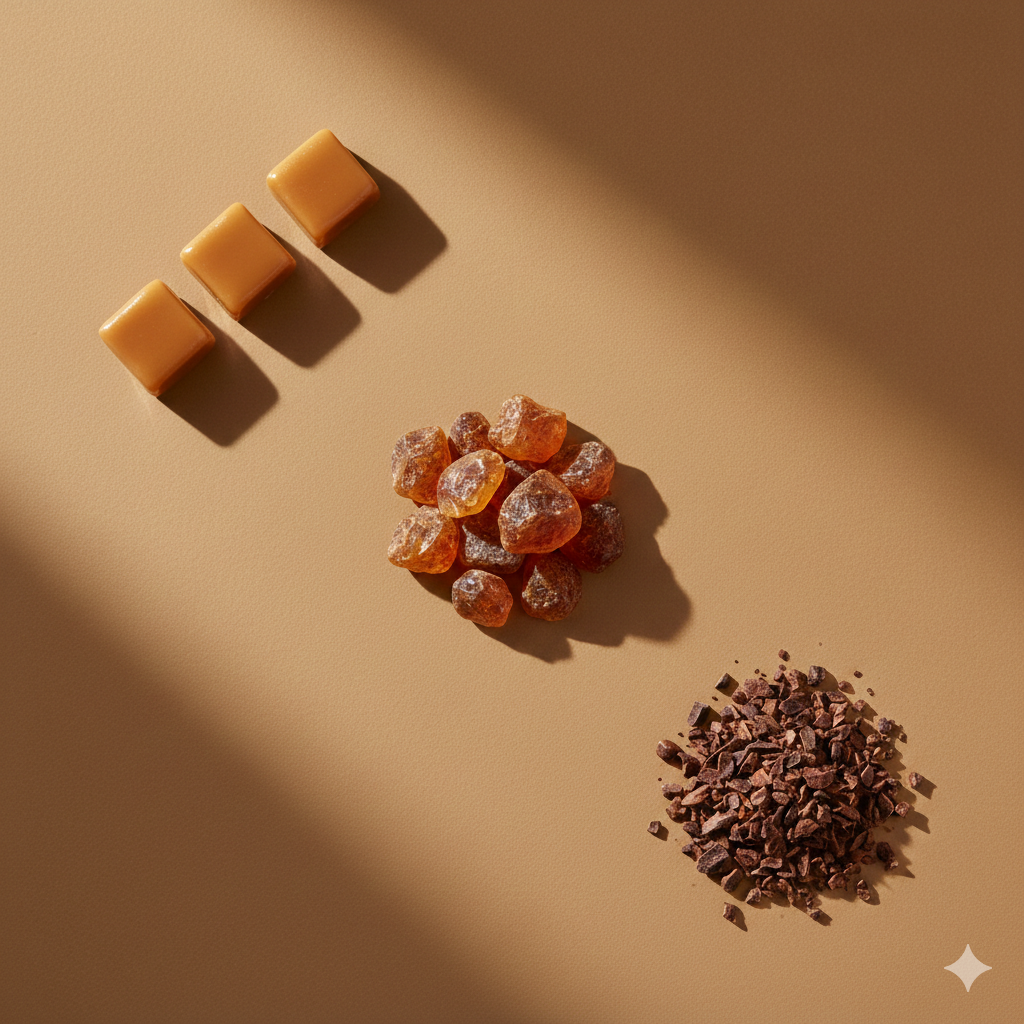Inspired by dulce de leche, the fragrance unfolds with notes of caramel and cocoa blossom layered over warm amber. The sweetness feels smooth and enveloping rather than sharp, deepened by amber’s soft glow against the skin.