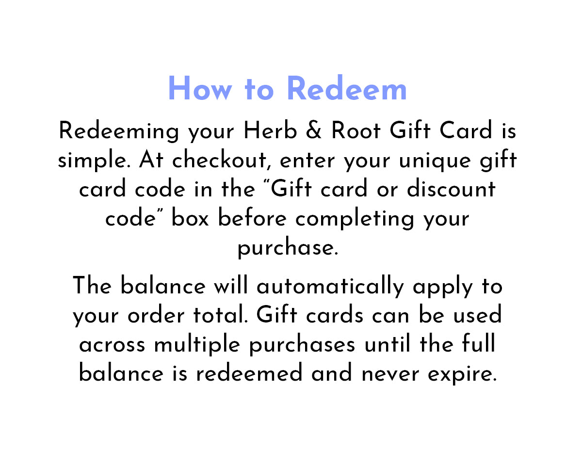 Give the gift of ritual. Herb & Root Gift Cards arrive instantly by email, never expire, and can be used toward any fragrance, powder, or botanical self-care ritual.